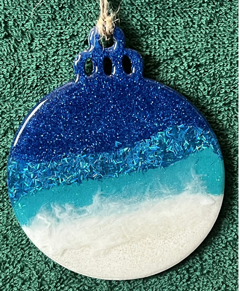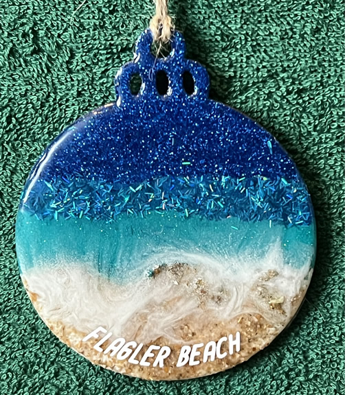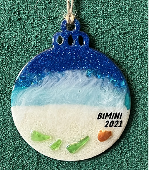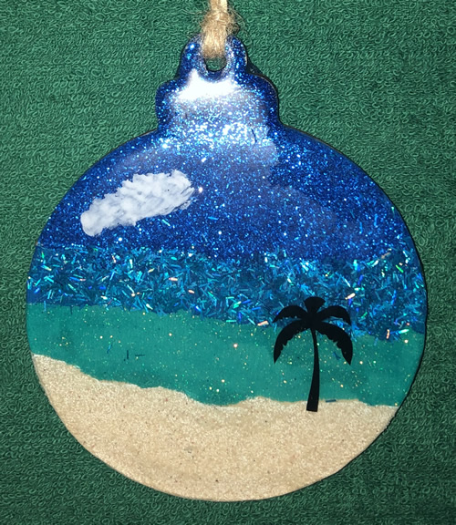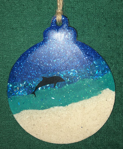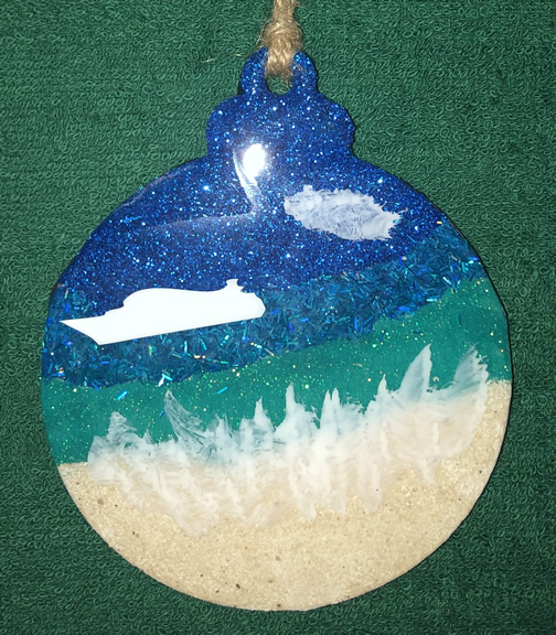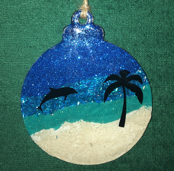 Our beach ornaments are made with real sand from beaches all over the world. They are covered with epoxy for a smooth finish that lasts a lifetime! Several options available – with or without waves, clouds, dolphin, palm tree, cruise ship, sea glass or shells, some options have an additional cost. The back can customized with place, year etc. for an additional $2. Custom orders will be ready for pickup or shipping in approximately 1 week to ensure the epoxy is completely cured.