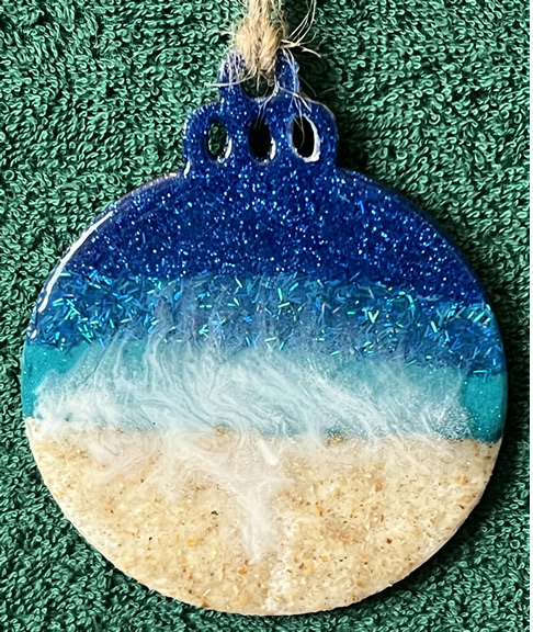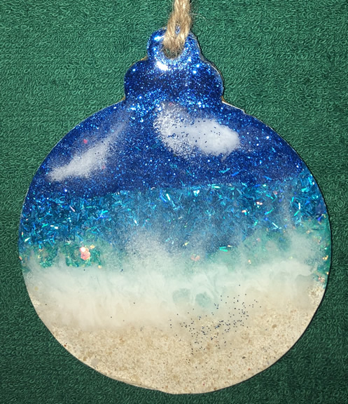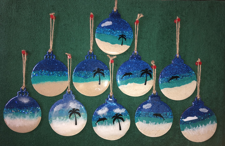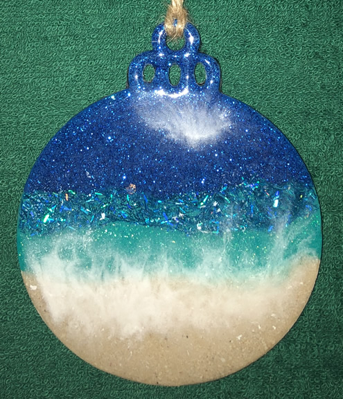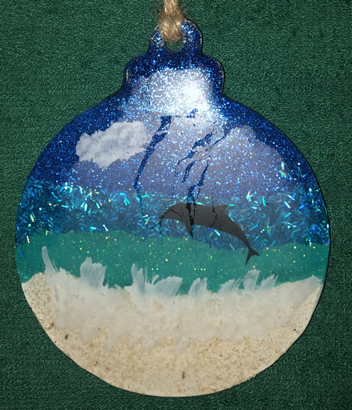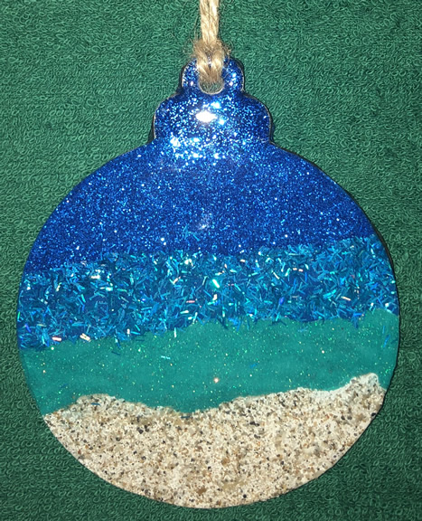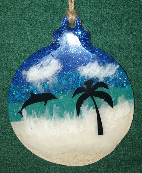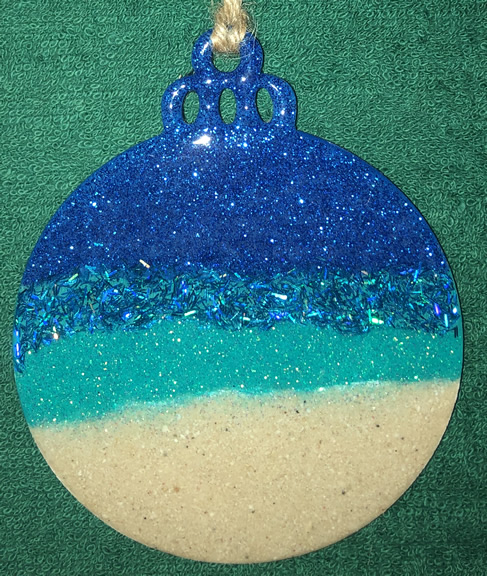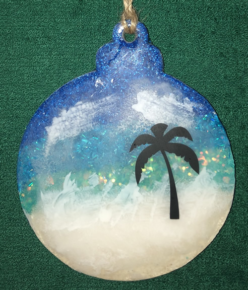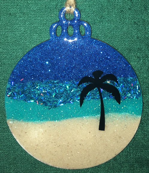 Our beach ornaments are made with real sand from beaches all over the world. They are covered with epoxy for a smooth finish that lasts a lifetime! Several options available – with or without waves, clouds, dolphin, palm tree, cruise ship, sea glass or shells, some options have an additional cost. The back can customized with place, year etc. for an additional $2. Custom orders will be ready for pickup or shipping in approximately 1 week to ensure the epoxy is completely cured.