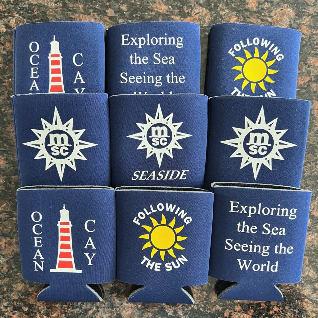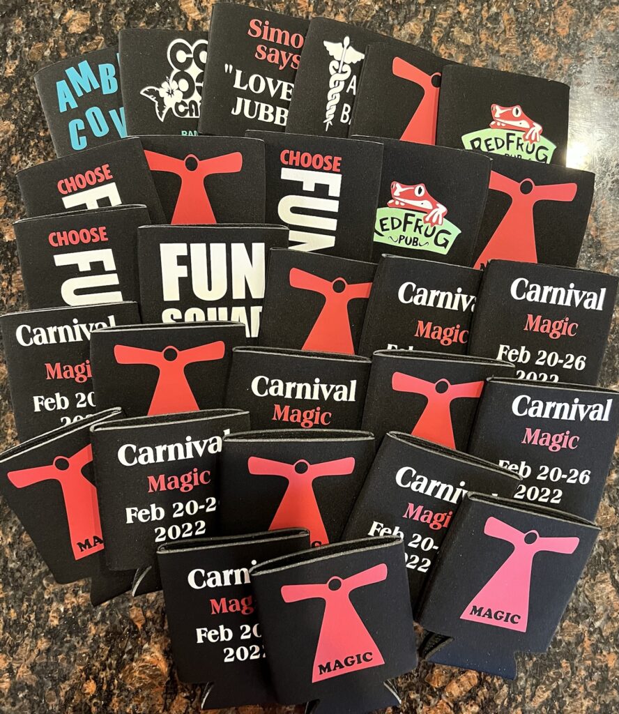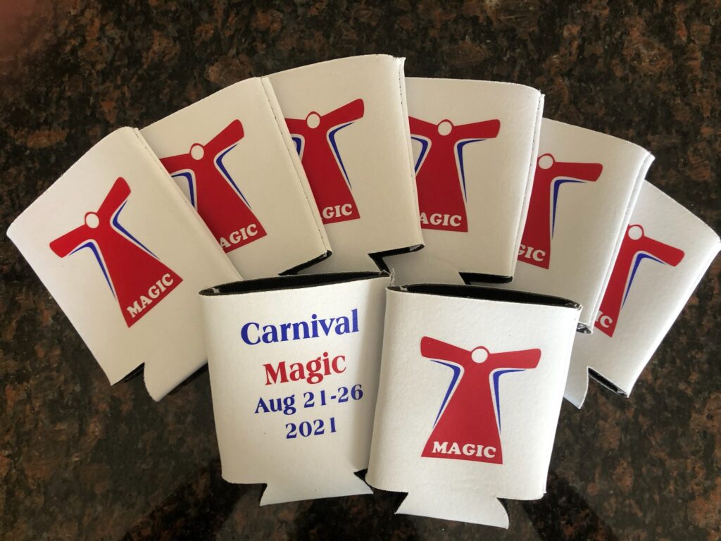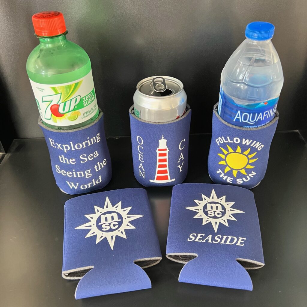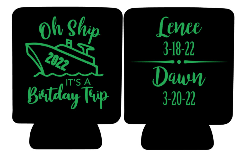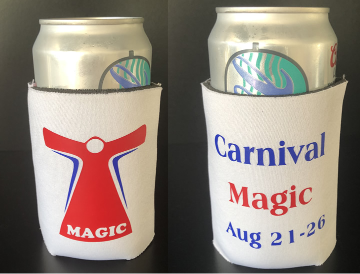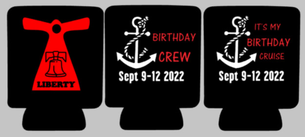 We create can and bottle coozies for all occasions. Below is a sample of some we have created for cruising. These can be customized for any cruise line, ship, dates or special occasions.