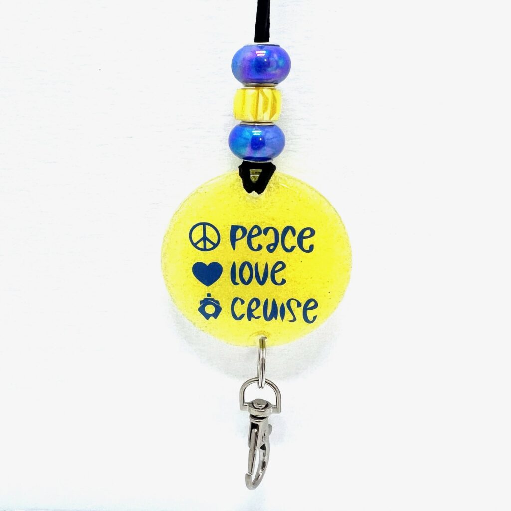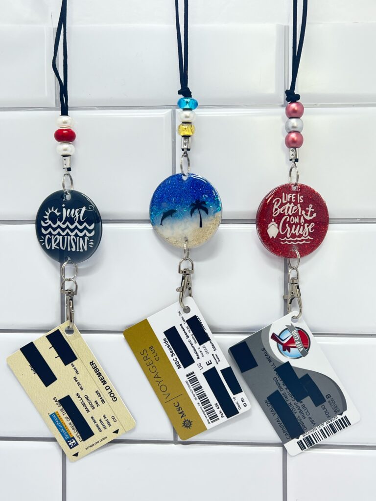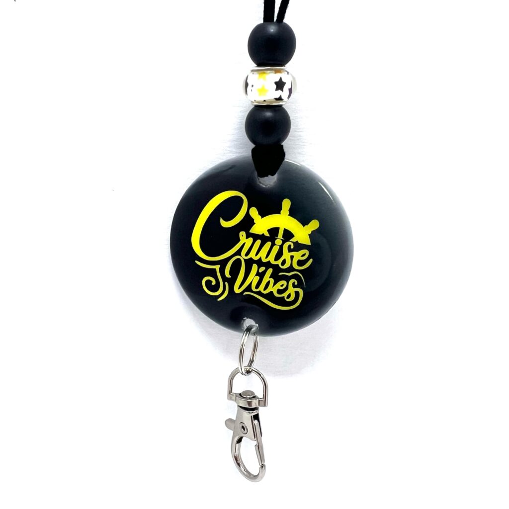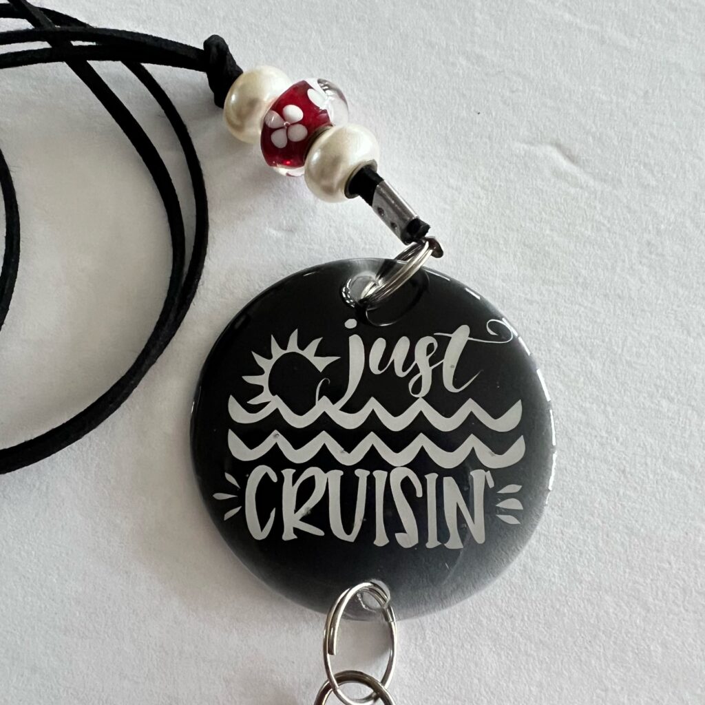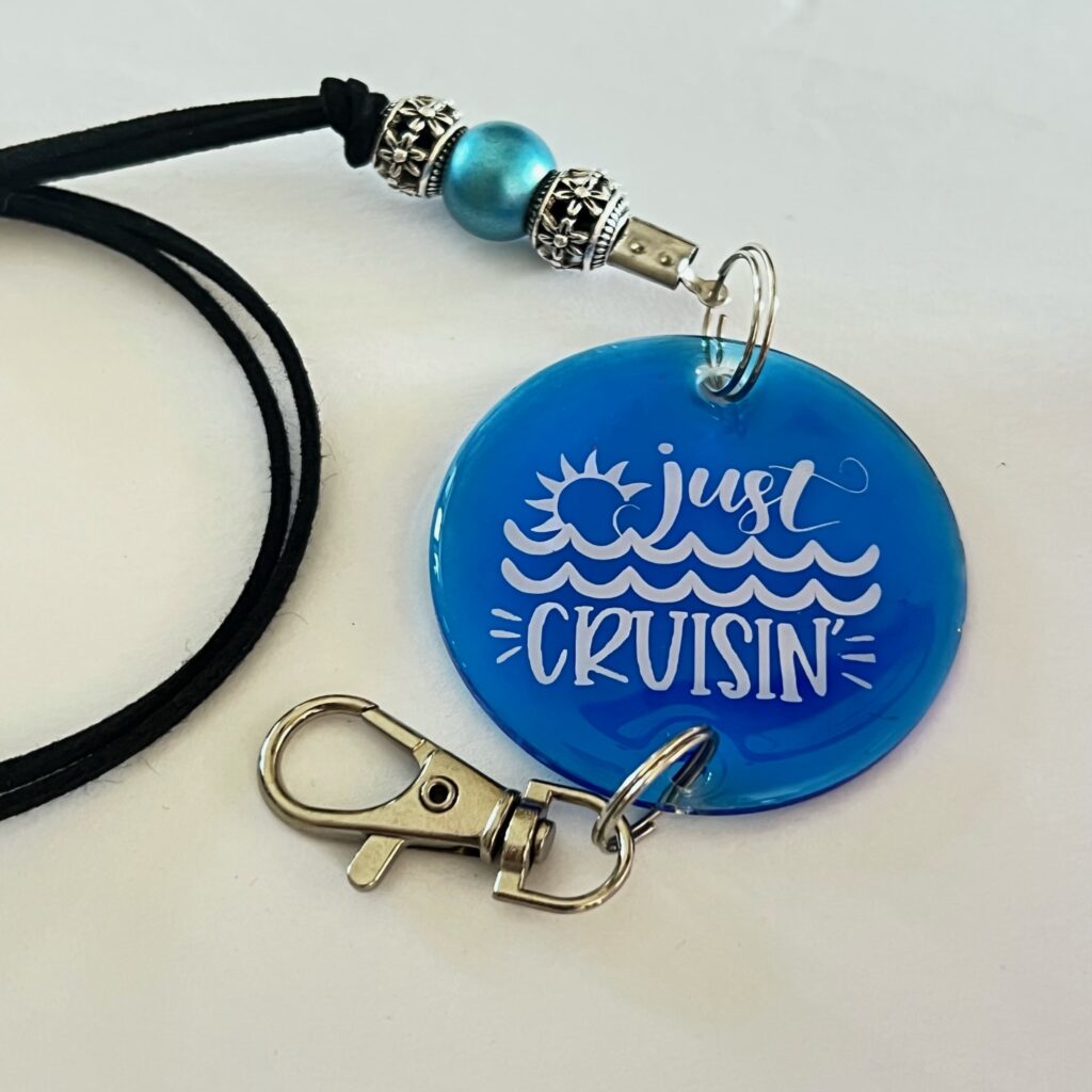Love to cruise but hate carrying your room card? Our customized cruise lanyards are perfect for you! They measure between 17-20″ in length. The acrylic disc is 2″ and is customized with the color and design of your choice. Each comes with 3 coordinating beads, a breakaway connector and a swivel lobster clasp making it easy to remove your card. Our lanyards are custom made with your choice of disc color, design and beads. The turnaround time for these is approximately one week. However we have several lanyards that are ready to ship if you need one sooner, see below for currently available lanyards.